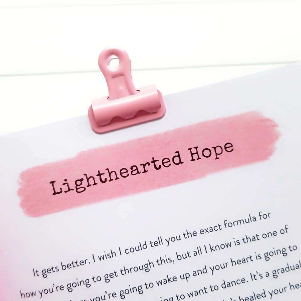 This hardcover book is small in size – 5.45″ x 6.35″ – but full of such big truth. There are 144 pages with beautiful handlettering and artwork throughout. There are 60 short easy to read devotionals with titles such as Lighthearted Hope, Simply Be, God Carries You and Follow Him.