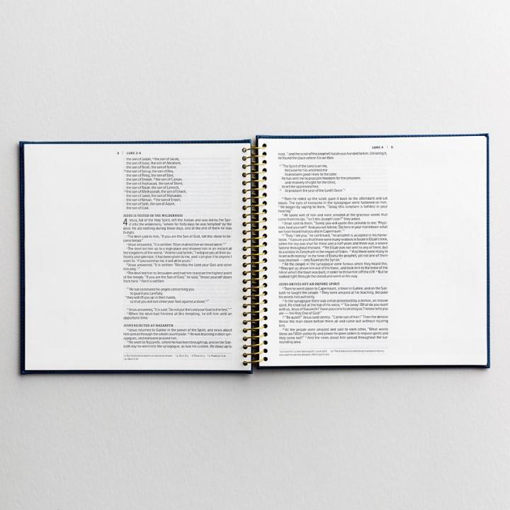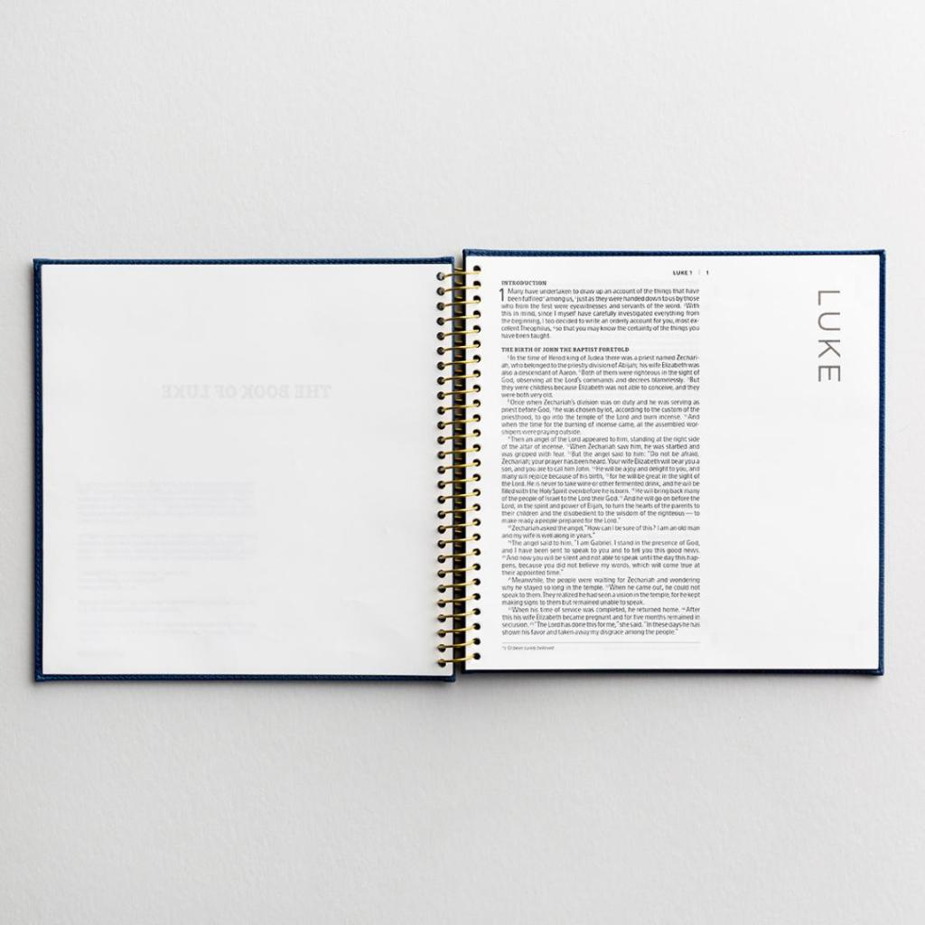 The same thick paper is used as in the Illustrating Bible, but with a gold spiral. It also has a hard chipboard cover making it durable for journaling on the go. It is a beautiful navy color as you can see in the photos below. The version is NIV and great news – the font is larger – 12 point! Each is $24.99. A perfect price for yourself and others on your Christmas list!